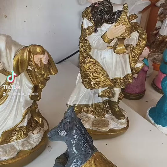 Pesebre 9 piezas 30 cm alto pieza mas alta. El pesebre pintado es solo ejemplo de cómo lo puede realizar usted mismo. Las piezas se venden en bruto sin pintar.
